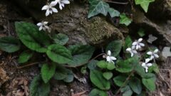 とても小さな白い花をつけ、小さいながらも暗い沢筋では意外と目立つ花序の花です。