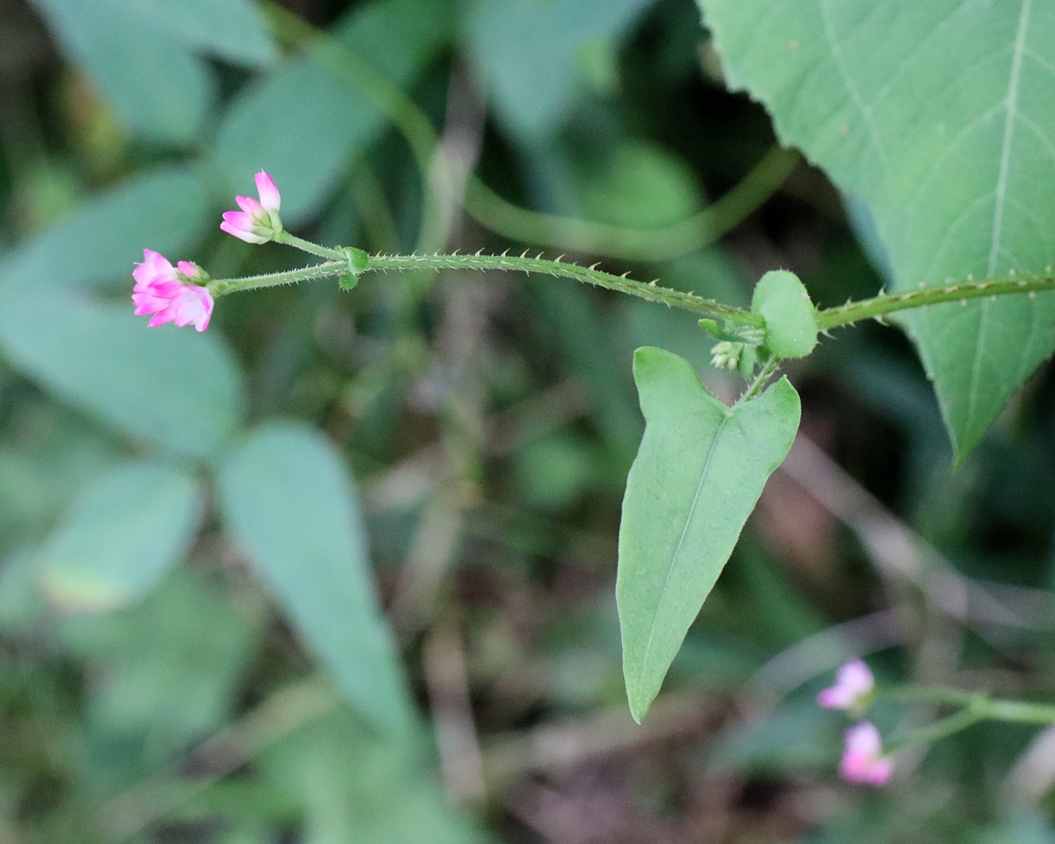 ママコノシリヌグイ 野山の植物2020/09/15 狭山丘陵 2019.09.072025.09.22 ママコノシリヌグイ (タデ科イヌタデ属)【継子の尻拭い】 (Persicaria senticosa) 別名:トゲソバ 2020/09/15 狭山丘陵 秋に湿地や田んぼの周辺に咲くタデの仲間は、「ミゾソバ」や「アキノウナギツカミ」など何種もありますが、これは茎に下向きの棘があり、「アキノウナギツカミ」などよりも硬く鋭いのでしっかり痛い棘。 憎い継子の尻をこの草で拭くという陰惨なネーミングの元となった棘です。 葉が独特の三角形で、茎の途中に丸い托葉がつきます。 花序の花数は少なく、ミゾソバなどと比べるとまばらです。 2025/09/13 東村山市 2021/08/25 狭山丘陵 2019/09/05 調布市野草園 2019/09/05 調布市野草園 2019/09/05 調布市野草園 【Youtube 山川草木図譜チャンネル】