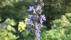 葉柄の途中から3-4個ひとかたまりの花序が出て、紫色の花を咲かせます。