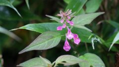 うす青紫に濃紫の斑点を散りばめ、黄緑色の蜜腺をもつ花のデザインは「アケボノソウ」によく似ています。