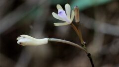 つる状に伸びた先に咲く花は黄緑色であまり目立たず、花が落ちて萼片だけ残ったような感じです。