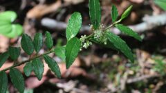 茎先にひとつだけつける穂状花序には細かい白い花がつきますが、花弁は無く白い花びらは萼片で、雄しべの葯がピンク色で綺麗です。