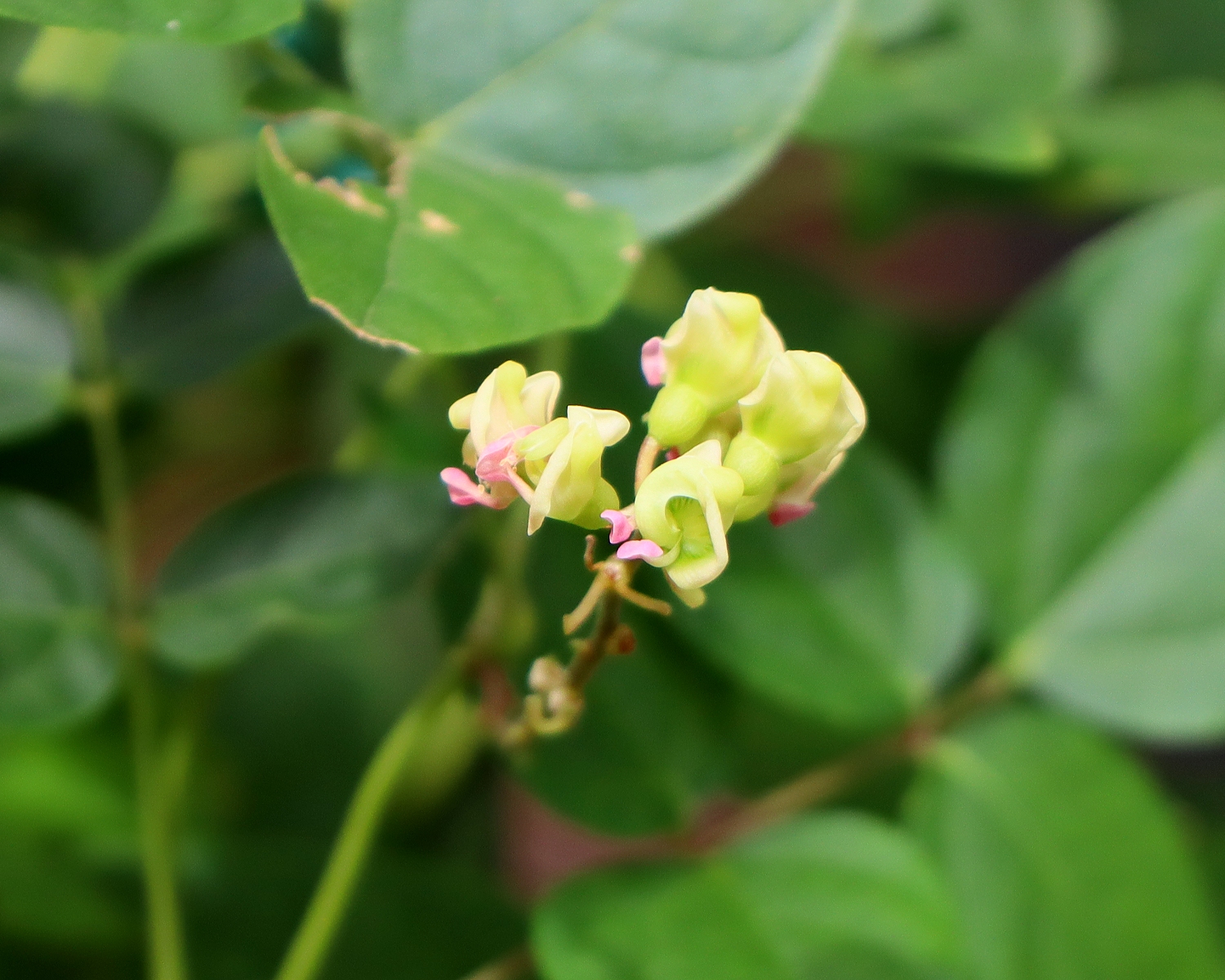 花は明るい黄緑色で翼弁尖端が赤紫になるのですが、この花の形が複雑で理解し難いです。