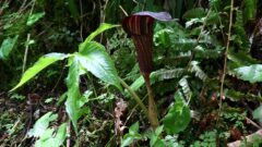 壺型の花は先端が3-5裂し、朱色と黄緑色のツートンカラーになっています。