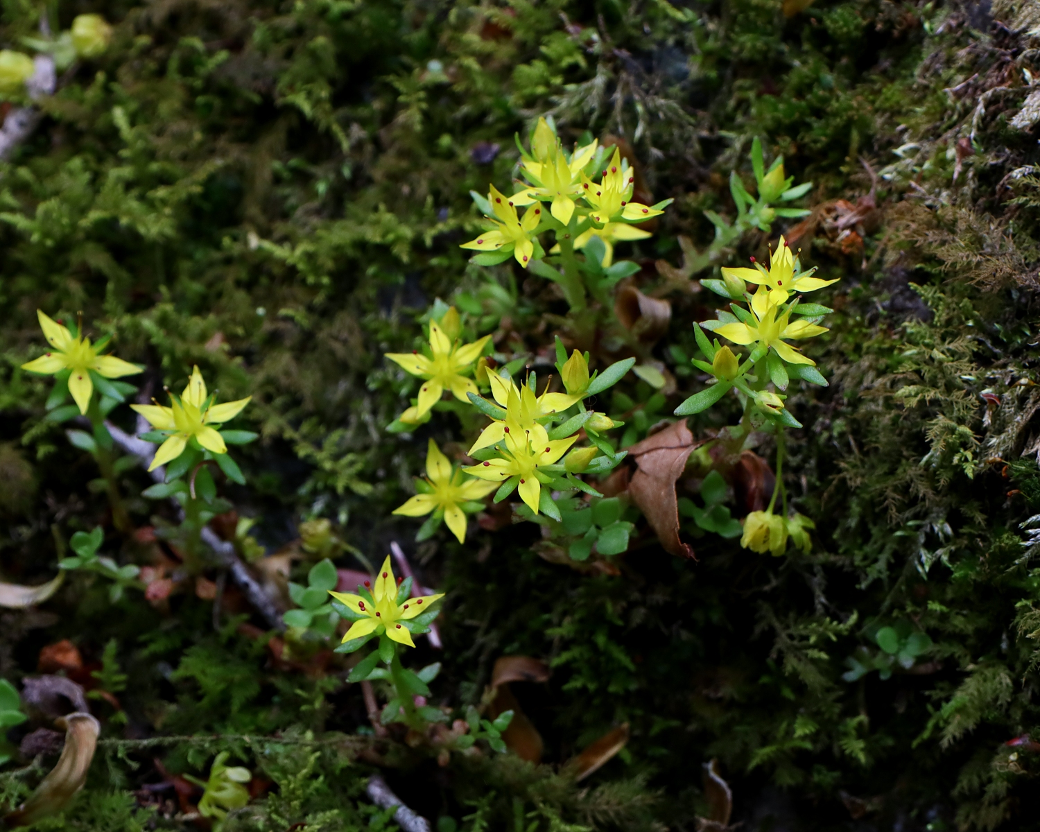 関東以西の山地の沢沿いや湿った林下の岩上などに群生する、山地性のマンネングサです。