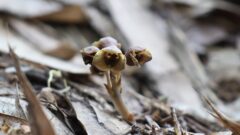 クロヤツシロランの花が、地味ながらもランの花の形態をもって開花するのに対し、このアキザキヤツシロランでは開花しても暗色で筒状の半開き状態で終わるので、よりキノコ的な雰囲気の花です。