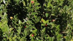 先の尖った長卵形の葉には班は無く、縁がやや波打っています。