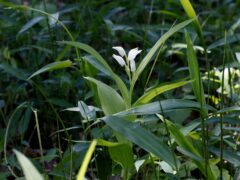 薄暗い林内で、純白の花が浮かび上がって目立っています。