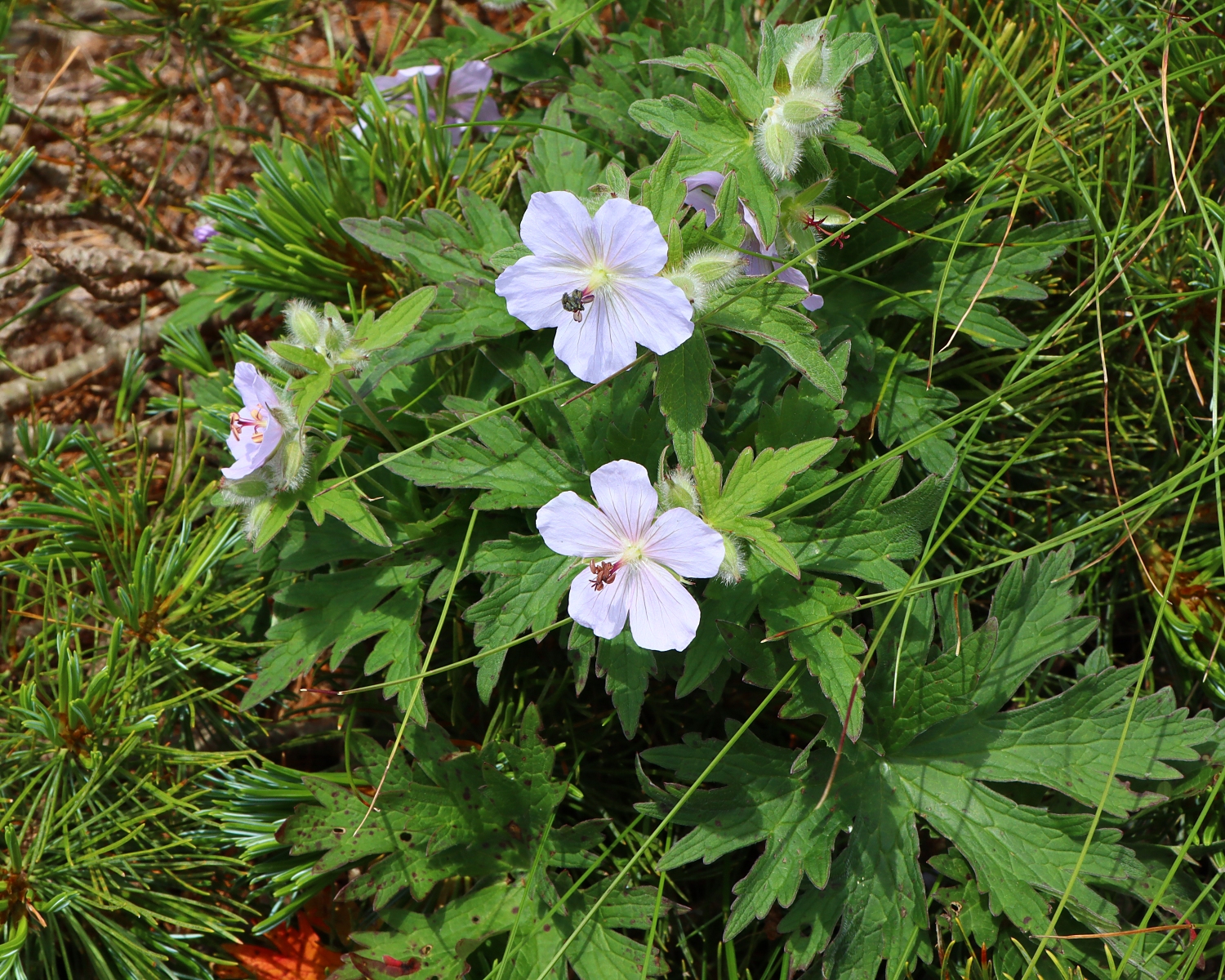 葉は5-7裂して切れ込みますが、エゾフウロに比べると浅く、裂片の先端があまり尖らないとされています。