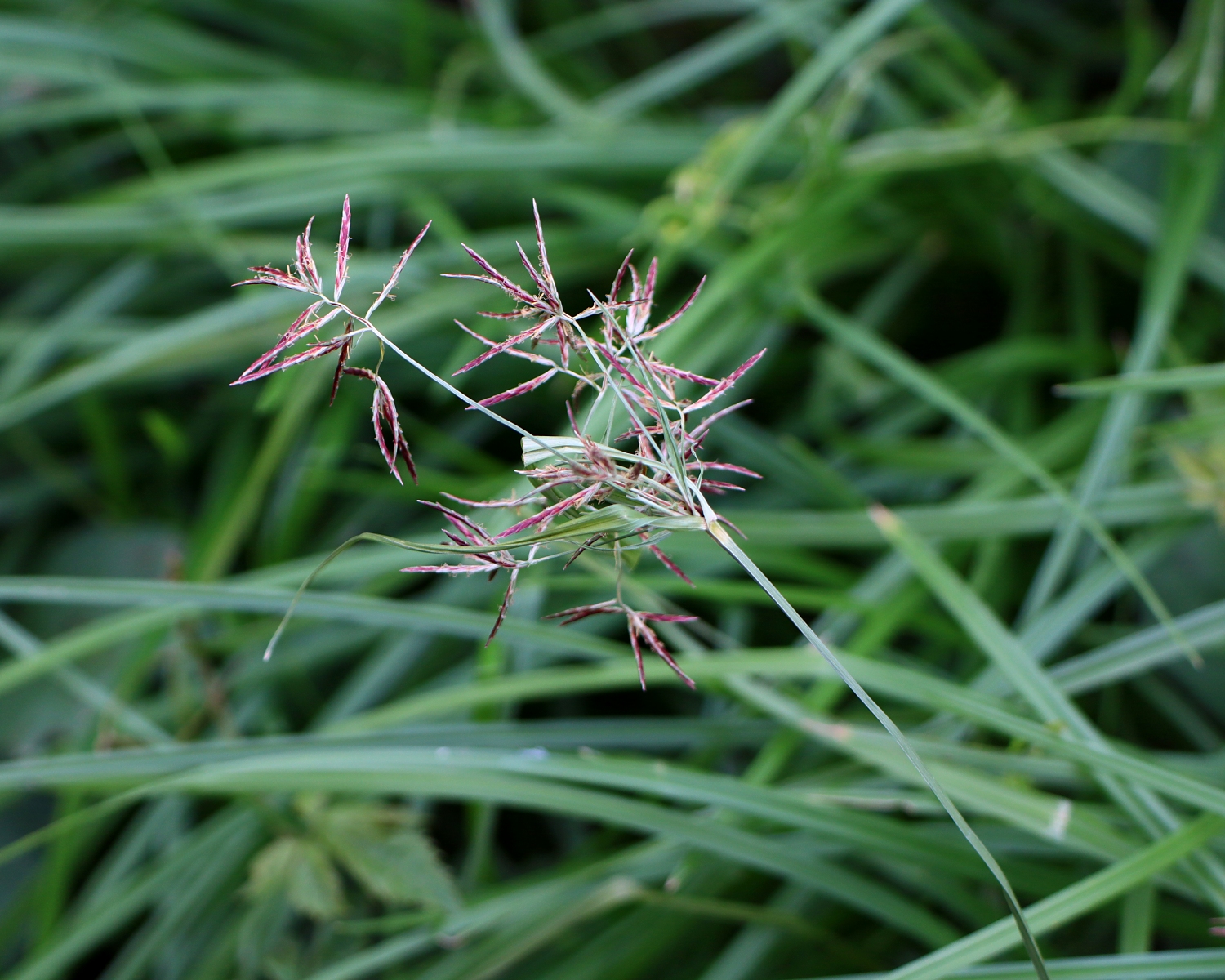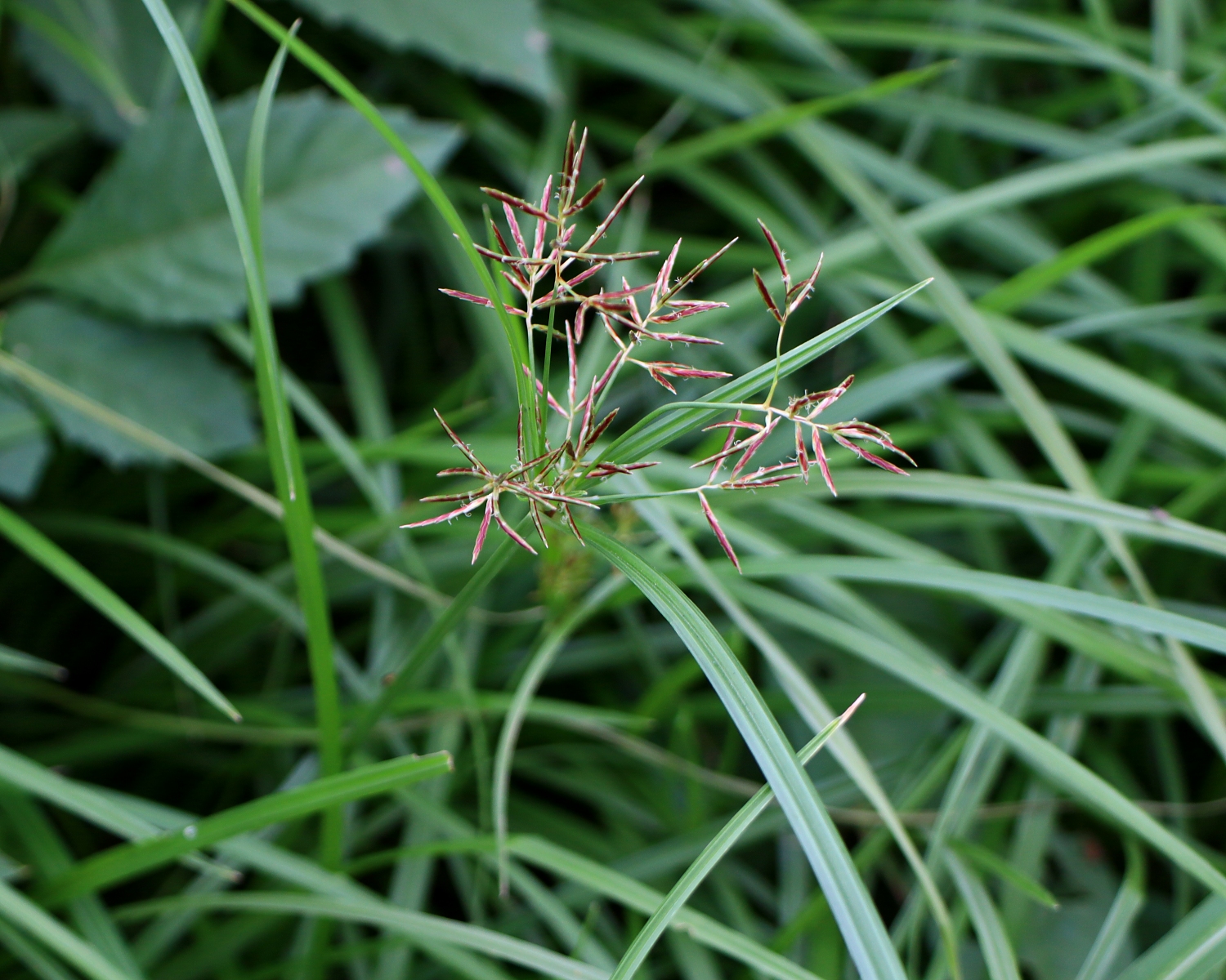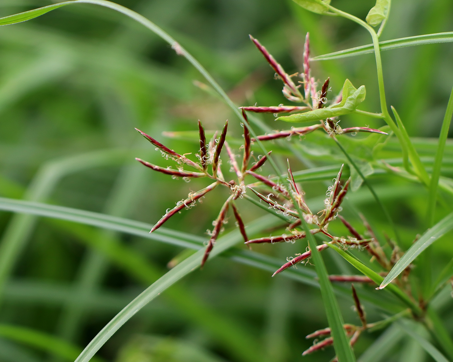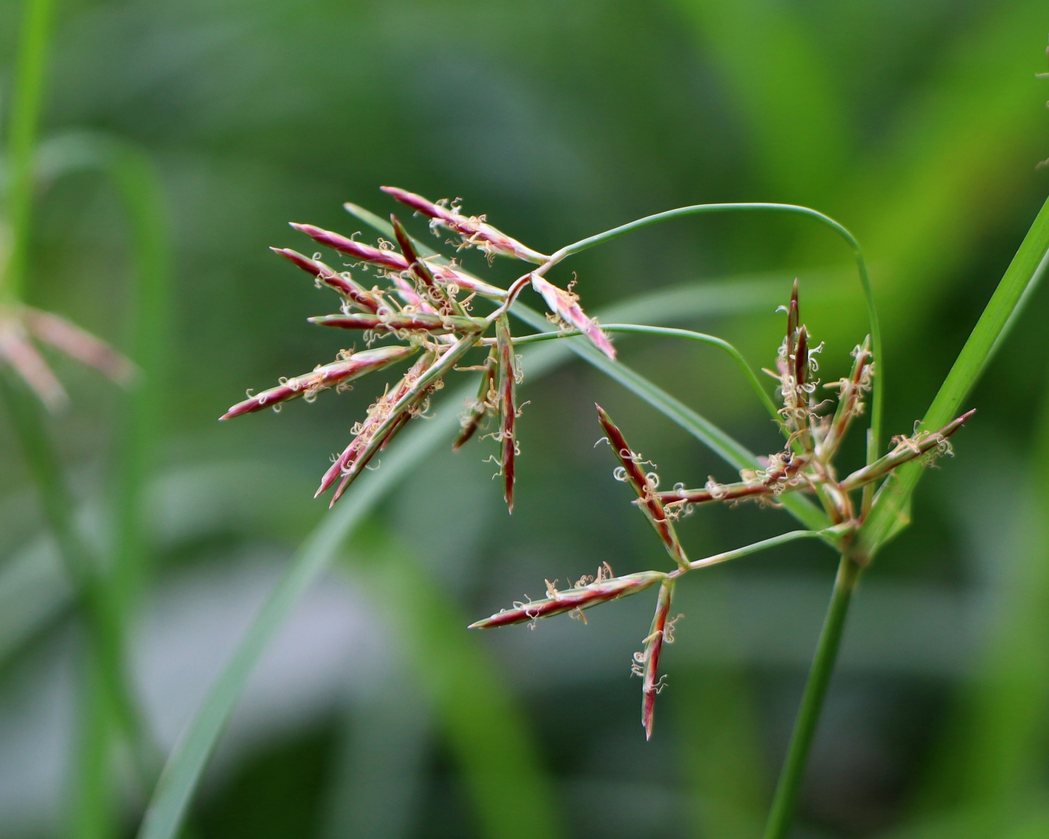 赤褐色の小穂から花柱がひょろひょろと出ています。