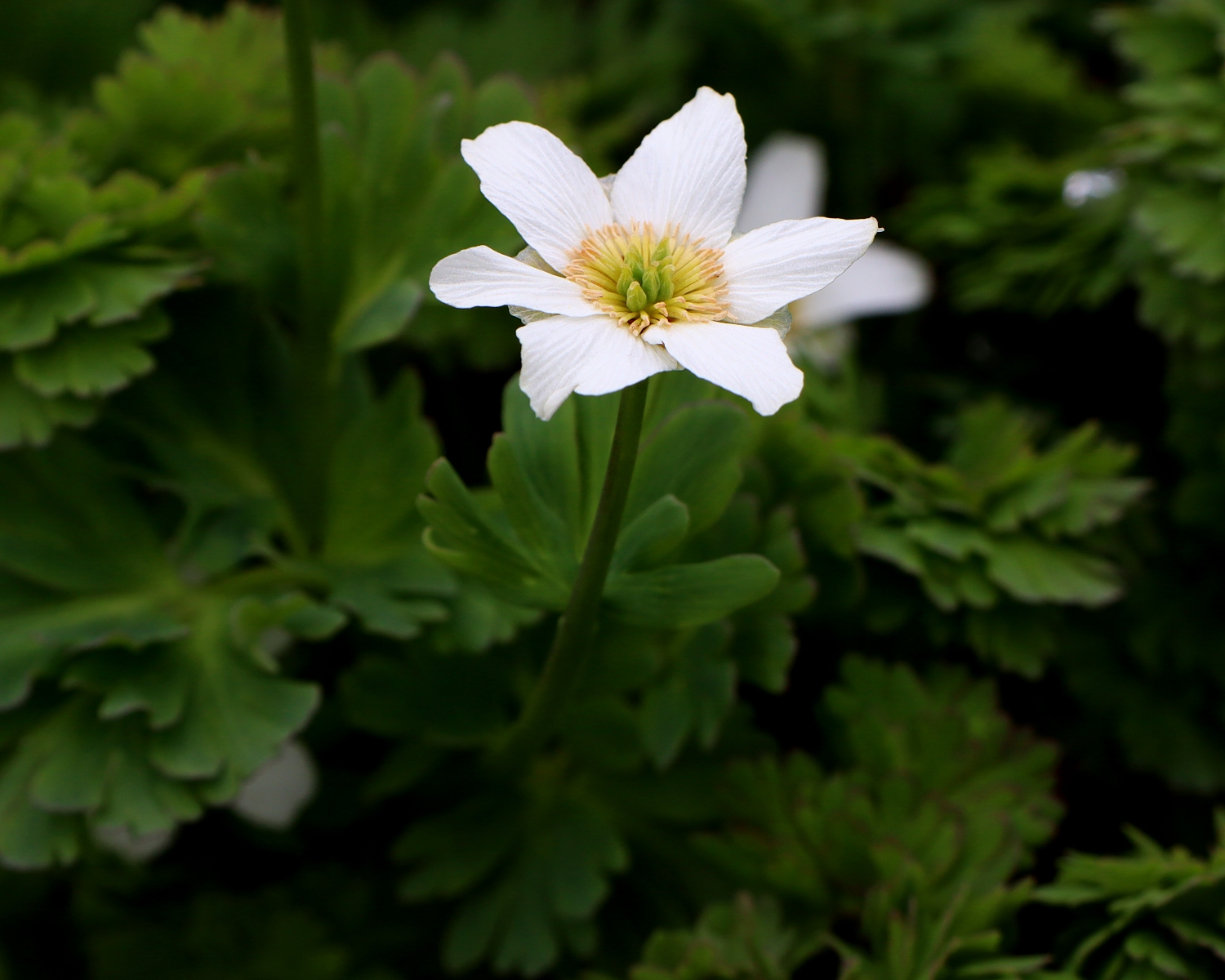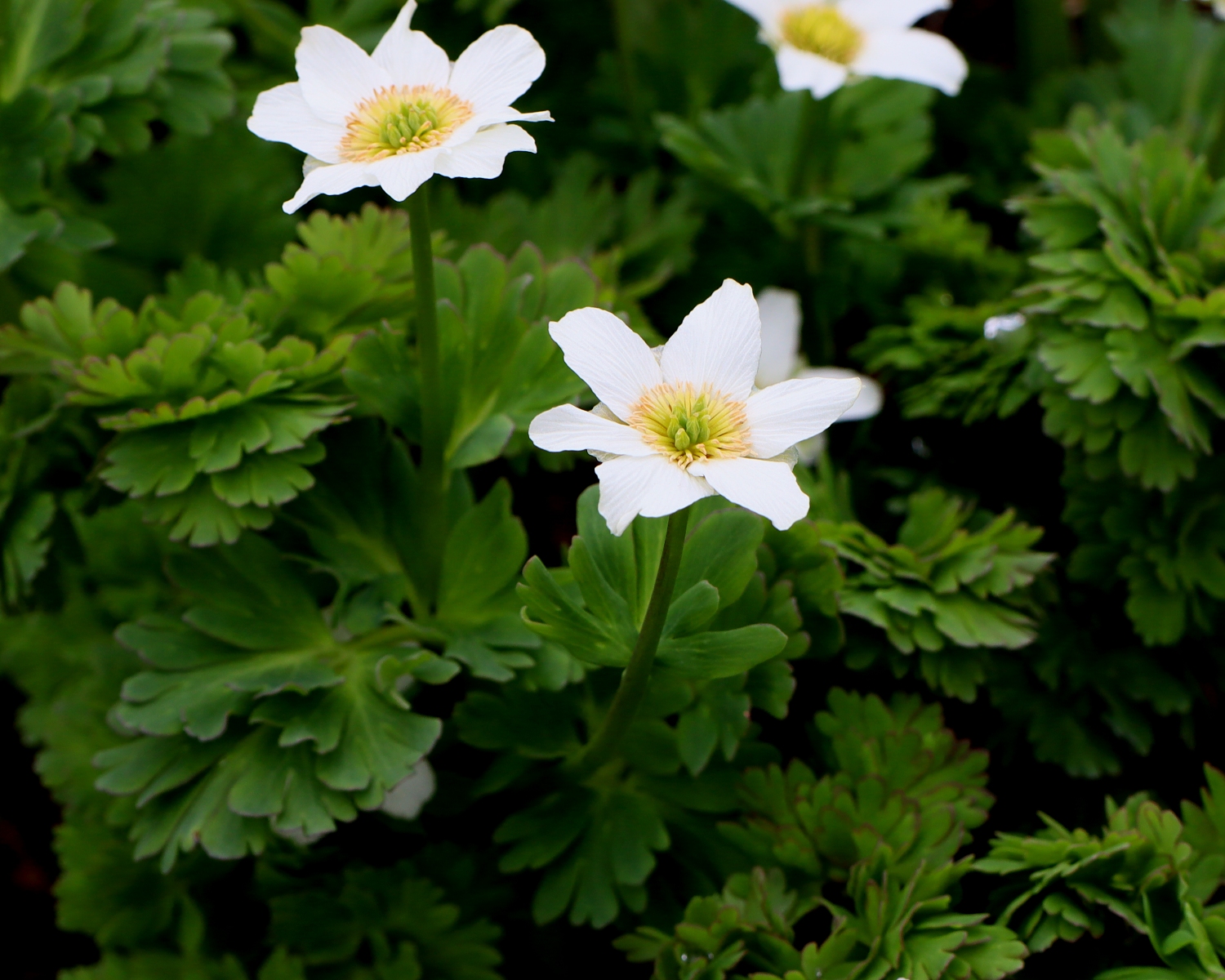 遠目には同時期に咲く「ハクサンイチゲ」に似ていますが、6〜8枚の花弁の先端にはくぼみがあり、特徴的な葉には毛がありません。