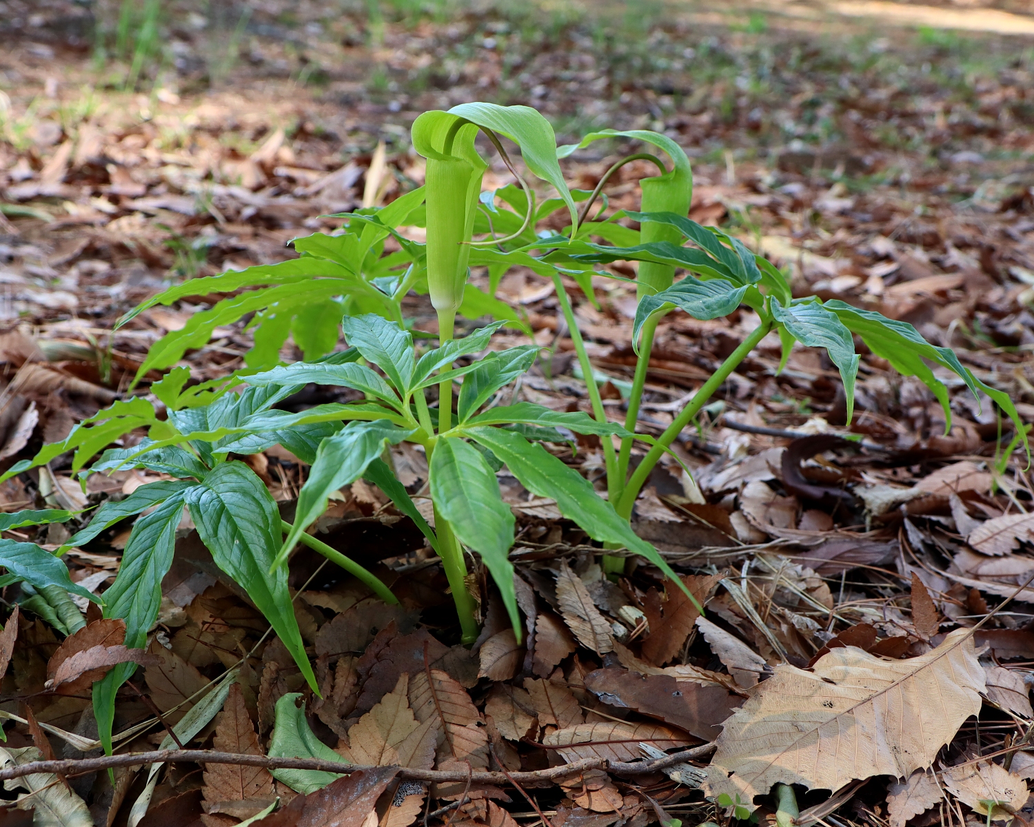 また、小葉が9-15個の鳥足状に分裂する葉は2個で、緑色の仏炎苞の中から付属体が伸びますが、マイズルのように直立せず横に伸びます。