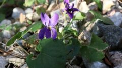 丘陵の下生えや枯れ葉の中に小さな紫色が見え、何の花だろうとよく見ると、とても変わった造形を発見。