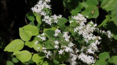 白い5弁花は薄い花弁の縁が紙をちぎったように細かいギザギザになっています。
