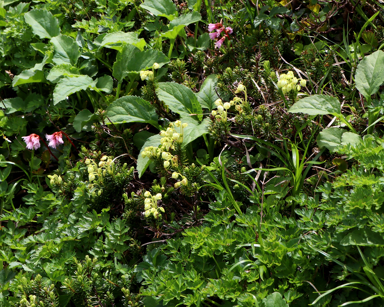 アオノツガザクラ 高山植物2021/06/12 白馬五竜高山植物園 2017.08.052026.01.07 アオノツガザクラ (ツツジ科ツガザクラ属)【青の栂桜】 (Phyllodoce aleutica) 2021/06/12 白馬五竜高山植物園 ハイマツ帯や岩礫地などの高山帯に生える「ツガザクラ」の仲間で、花がうす緑なので「青の」と呼ばれています。 どれも草ではなくたいへん小さな低木です, 北海道から本州中部地方以北に分布。 この「アオノツガザクラ」は大雪では「エゾノツガザクラ」との間に雑種をつくるそうで、形質の表現によって「コエゾノツガザクラ」や「ニシキツガザクラ」などと呼ばれています。 2017/07 大雪山 ピンクがエゾノツガザクラ、うす緑がアオノツガザクラ 2017/07 大雪山 2018/07/19 木曽駒ケ岳 2018/07/19 木曽駒ケ岳千畳敷カール 2018/07/19 木曽駒ケ岳 2021/08/01 乗鞍岳 2025/07/10 早池峰山 2021/06/12 白馬五竜高山植物園 【Youtube 山川草木図譜チャンネル】