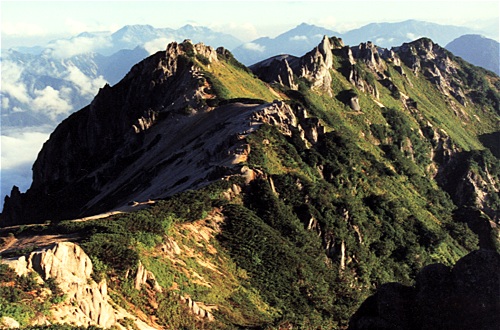 仙人でも隠れていそうな岩と緑の静かな峰。