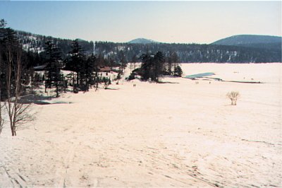 尾瀬沼湖畔の山小屋もこの季節には大雪原のほとりにたたずむ