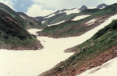 真砂沢から剣沢へ、多くの急峻な枝沢を加えながら雪渓は続く。