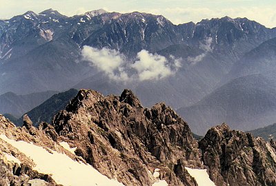 剣岳山頂から黒部の深い谷を隔てて、白馬三山から唐松岳が並んでいる。